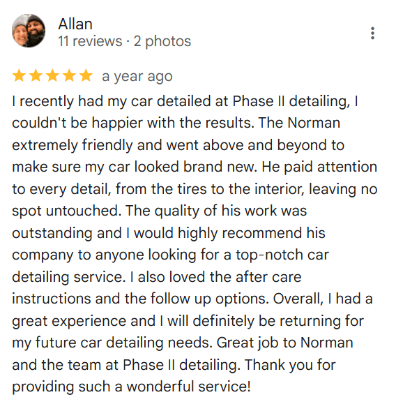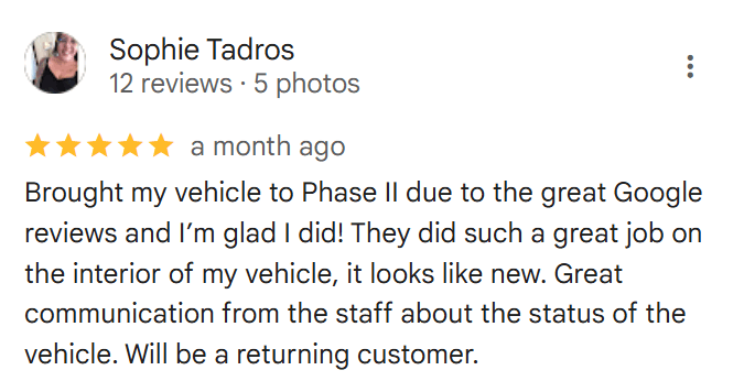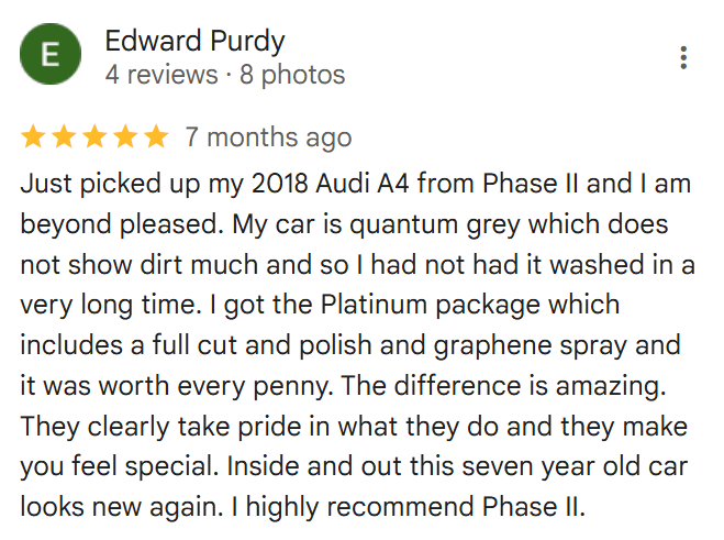 Experience top-quality car detailing at home with Phase II. From full detailing and waxing to vacuuming and advanced protection, we provide everything your car needs to stay spotless and protected longer.